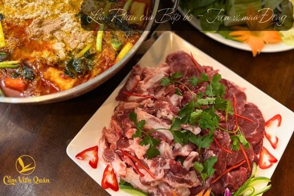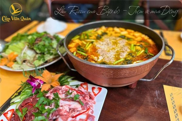 Điểm đặc biệt của món Lẩu Riêu Cua Bắp Bò tại Cầm Viên Quán nằm ở riêu cua đồng nguyên chất, được giã tay hoặc lọc kỹ, cho ra phần gạch cua vàng óng và hương thơm tự nhiên.